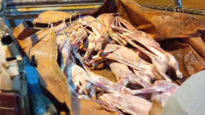 Durante la inspección, los agentes constataron que en la caja del vehículo se transportaba una gran cantidad de animales ovinos faenados, lo que implicaba una clara infracción al Código Alimenticio Provincial.