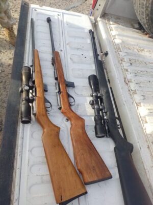 El conductor, un hombre de 35 años, propietario del vehículo, presentó una credencial de legítimo usuario y tenencia de una carabina semiautomática calibre .22. Lo acompañaban sus dos hijos menores y su progenitor, quien también portaba una credencial de legítimo usuario y tenencia de otra carabina calibre .22. Sin embargo, la tercera arma de fuego, una carabina calibre .22 con culata de madera y mira telescópica, tenía los números de serie limados y carecía de documentación que acreditara su propiedad.
