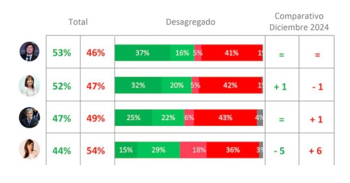 La consecuencia de la pelea pública se vio reflejada en el estudio, el cual ubicó a Victoria Villarruel como la dirigente oficialista con peor imagen: su valoración negativa aumentó seis puntos con respecto a diciembre de 2023 -cuando asumió- y ahora acumula un total de 54%. La positiva, en cambio, cayó 5 puntos y es del 44%.