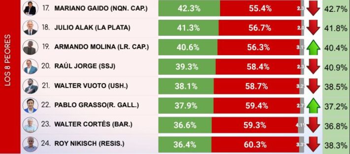 Mientras que los intendentes federales peores calificados de este mes son: Roy Nikisch de Resistencia con un 36,4% de aprobación en último lugar, seguido por Walter Cortés de Bariloche con un 36,6% y Pablo Grasso de Río Gallegos con un 37,9 % de imagen positiva.